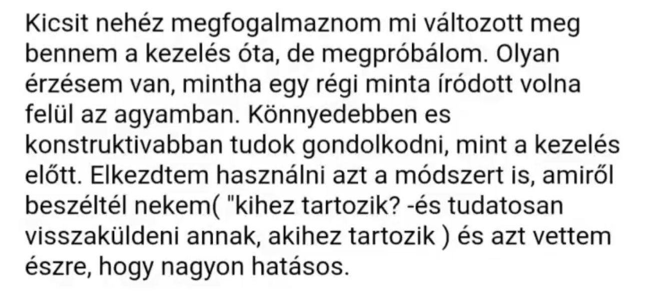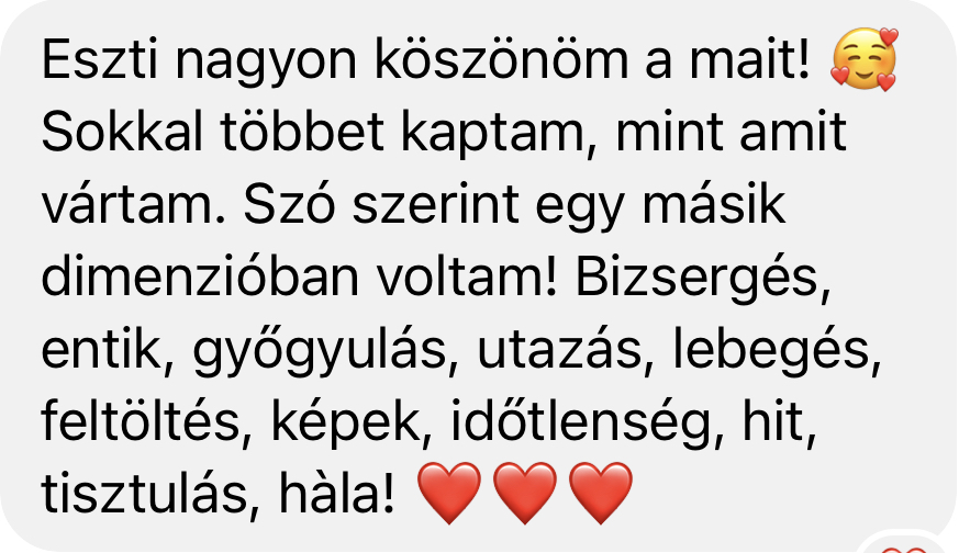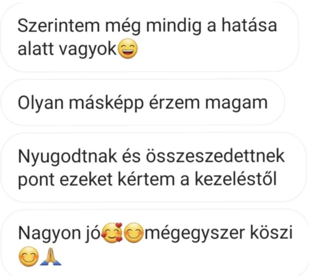 A kezelés utáni állapot gyakran békés, csendes, mélyen ellazult – mintha kiürülne a fejed. Ebben a térben önmagad lehetsz – ítéletek, megfelelési kényszerek, belső zaj nélkül.